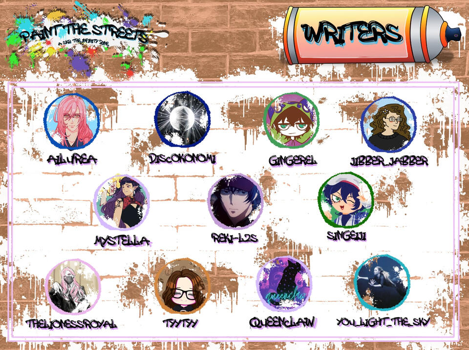Writers:Ailurea | Discokonomi | GingerEl | Jibber_jabber | Mystella | Queenclaw | Reki-L2S | Singeiji | TheLionessRoyal | Tyytyy | You_light_the_sky